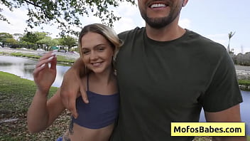 Petite blondie teen seduced near the lake by muscular bald dude - Joey White, JMac