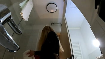 babe in t-shirt showers and cums