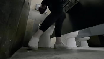 PUBLIC TOILET: Girl takes her panties down and plays with her PUSSY in a very busy PUBLIC toilet